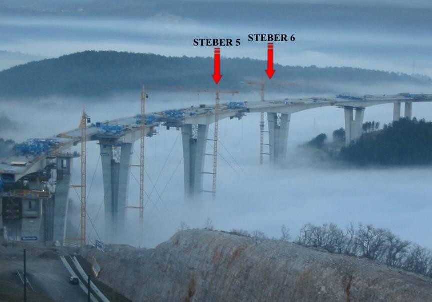 Gradnja viadukta »ČRNI KAL«. Dva najvišja žerjava sta bila 112EC-H8 z višino do kavlja več kot 100 m.