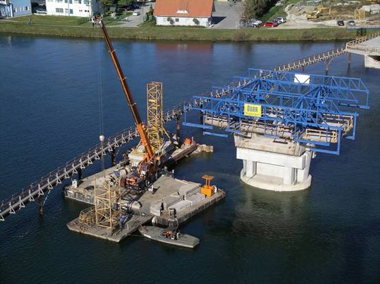 Gradbišče »PUHOV MOST« na Ptuju. Montaža žerjava 112EC-H8 na otočku sredi Drave.
